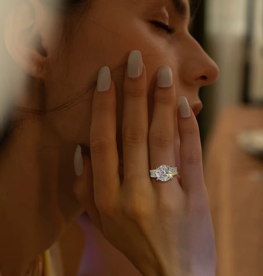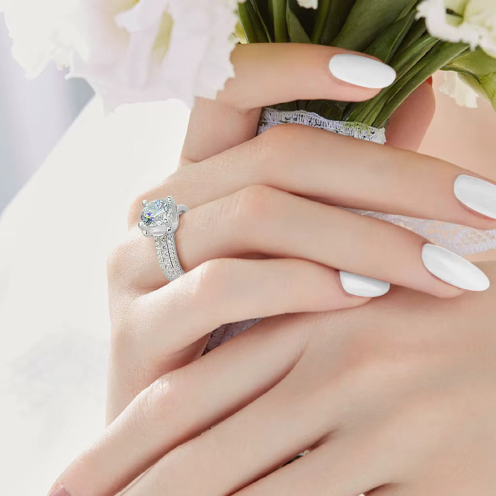Die blumenförmige Fassung symbolisiert Reinheit und Liebe, während fein gesetzte Zirkonia-Seitensteine den Hauptstein umrahmen und das Licht in alle Richtungen brechen. Jeder Ring wird präzise gefertigt und besteht den Diamanttest – ein echtes Qualitätsmerkmal feinster Moissanite-Schmuckkunst.